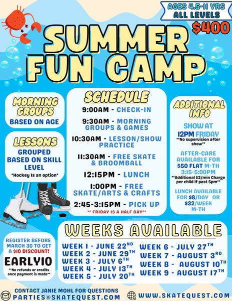 No matter the skill level, have your kiddo join us for skating, activities, and fun at SkateQuest, all summer long! Our Summer Fun Camp includes both on-ice instruction and off-ice activities, games, arts & crafts.