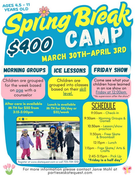 Make the most of spring break with a week of skating, activities, and fun at SkateQuest! Our Spring Break Camp offers a balance of on-ice instruction and off-ice activities.